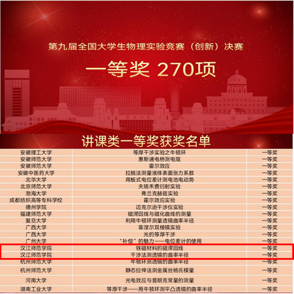 11月25日-26日,第九届全国大学生物理实验竞赛(创新)决赛在重庆大学虎溪校区成功举行,经过紧张激烈的角逐,beat365手机版官方网站3支队伍斩获讲课类一等奖2项、三等奖1项,beat365荣获优秀组织奖,创造了学校参加全国大学生物理实验竞赛以来的最好成绩。