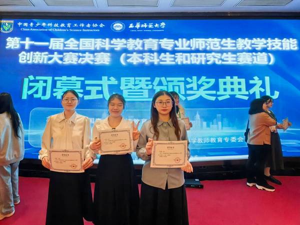 12月1日至3日,由中国青少年科技教育工作者协会主办,西华师范大学承办的第十一届全国科学教育专业师范生教学技能创新大赛决赛(本科和研究生赛道)在西华师范大学华凤校区举行。物电学院胡蓉、姜心懿、李卓群等3名选手在决赛中敢打敢拼,最终取得了3项三等奖的成绩。
