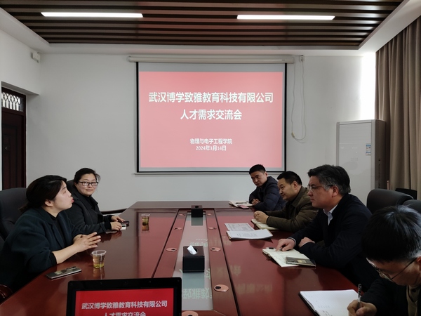 3月14日,武汉博学致雅教育科技有限公司总经理吴紫艳一行2人来院交流座谈,共同商讨毕业生招聘以及校企合作事宜。院分党委书记唐传球主持会议,beat365手机版官方网站领导班子、院办公室主任曾虎参加活动。