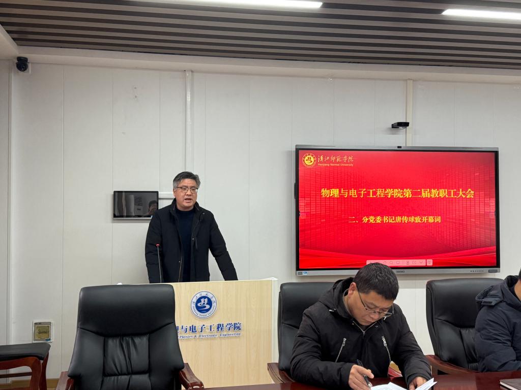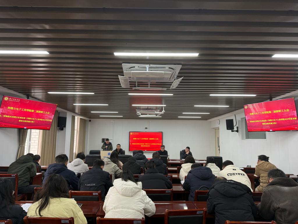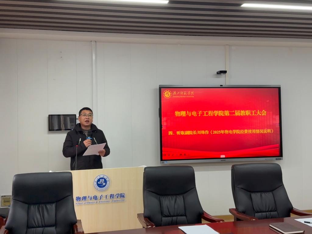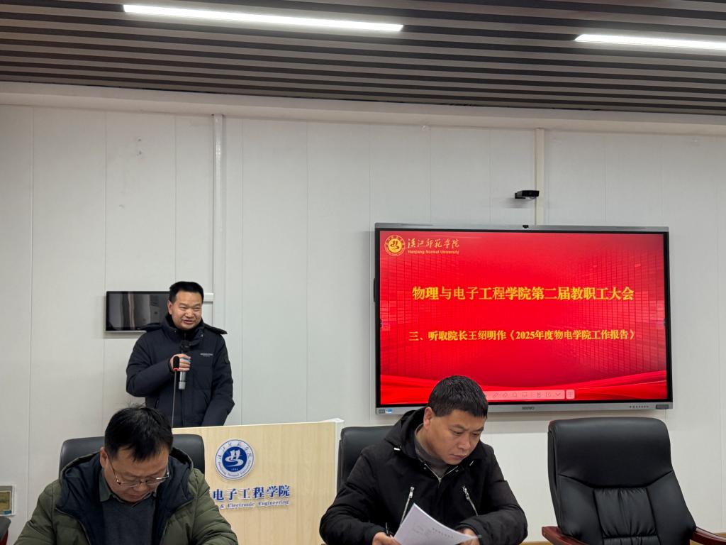 教职工大会在庄严的国歌声中拉开序幕。院分党委书记唐传球致开幕词,他代表学院向全体教职工一年来的辛勤付出表示感谢,希望大家把握“变”的趋势,主动谋划未来工作;树立“融”的理念,积极开展教育教学改革;坚定“进”的取向,提升服务区域发展的能力;强化“强”的追求,推动科研提质增效;对标“新”的导向,不断优化专业发展方向;饱含“暖”的情怀,营造和谐氛围;恪守“严”的要求,筑牢发展根基。号召全体教职工以高度的责任感和使命感,积极为学院的发展建言献策,充分发挥好教职工大会的作用。院长王绍明作《2025年度物电学院工作报告》,从学科建设、人才培养、科学研究、师资建设等方面全面回顾了学院过去一年的工作成效,系统分析当前面临的机遇与挑战,明确了2026年的工作目标与重点任务。副院长刘锋作《2025年度物电学院经费使用情况说明》。院长助理史长城详细解读了《2025年度物电学院绩效分配实施方案》。接着,与会人员围绕以上内容进行分组讨论,现场氛围热烈。最后,大会依次表决通过了相关方案及说明文件。会议在激昂的校歌声中圆满结束。