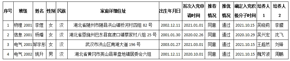 经物电学院学生党支部支委会审查,拟于近期召开支部全体党员大会,讨论李煜等4位同志转为中共正式党员。根据发展党员工作有关要求,现将其有关情况公示如下: