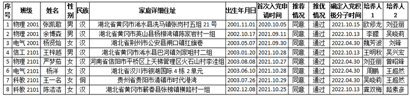 经物电学院学生党支部培养教育考察,认为张凯歌等8名同志已具备中共预备党员条件,拟于近期发展。根据发展党员工作有关要求,现将该8名同志的基本情况予以公示: