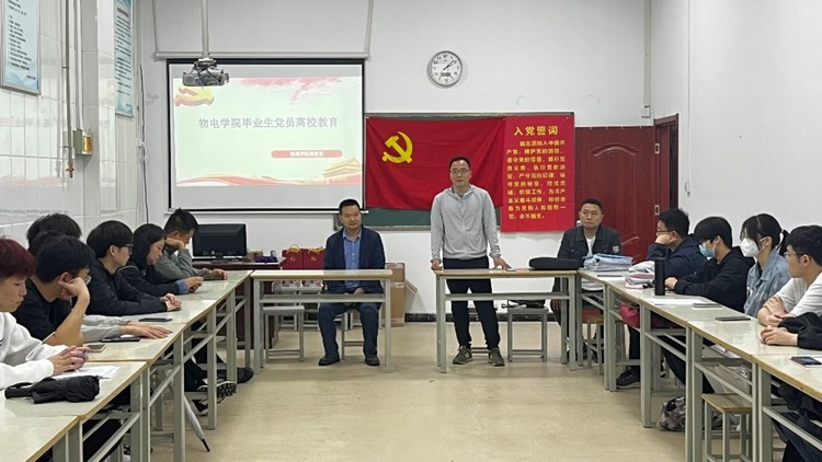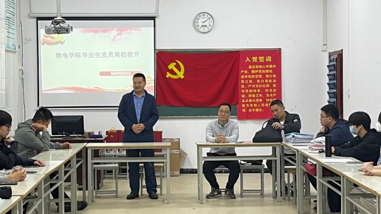 习近平总书记在党的二十大报告中指出:“当代中国青年生逢其时,施展才干的舞台无比广阔,实现梦想的前景无比光明”。为深入加强毕业生党员的党性教育、爱国教育,5月27日下午两点,物电学院于稻香园综合实验室召开了毕业生党员离校教育大会。学院院长王绍明、党总支书记石义杰、党总支副书记张玉龙、教工党支部书记欧修龙、学生党支部书记刘锋和部分教师党员出席,全体毕业生党员参加,本次会议由刘锋书记主持。