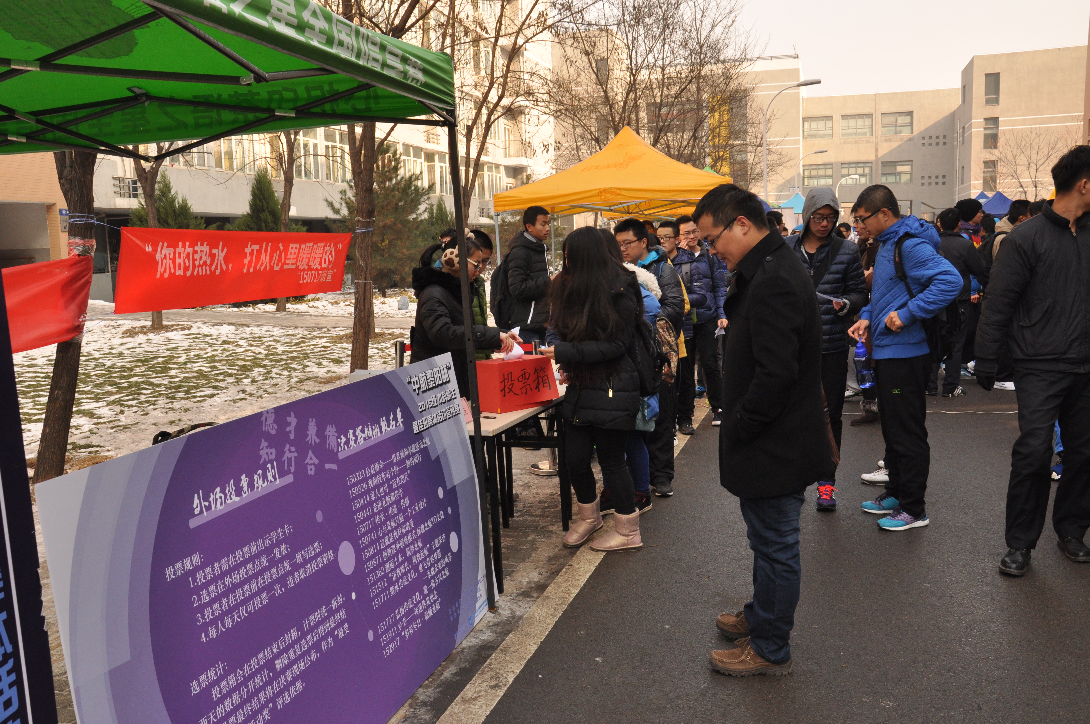 “中航黎阳杯”球盟会qmh网站2015级本科新生最佳班集体活动答辩赛外场展示于11月27日在沙河校区1,4号学生公寓楼之间开展,参加本次外场展示的是晋级决赛的十四个班级。