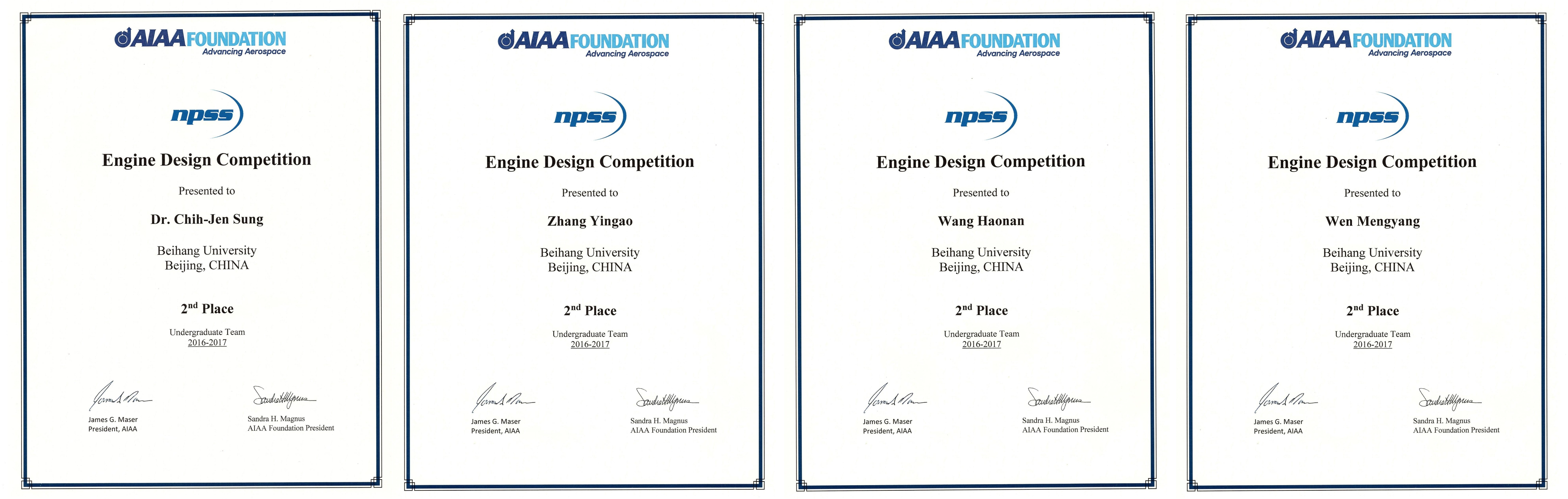 美国航空航天学会每年会组织世界航空航天领域的学生设计比赛,其中世界航空发动机设计大赛是航空领域参与学生人数最多的项目之一。2017年,该设计比赛的要求提案是一个关于对普惠公司PT6A系列涡桨发动机的改型设计,以期装配新发动机的全新飞行器能够完全取代现役的柏拉图PC-21型飞机。宋知人教授为了将国际前沿推进理论引入本科生课堂教学,于2016年5月在其面向本科生开设的名师研讨核心通识课程上首次介绍了该赛事的情况,并鼓励同学们积极参与,希望借此开阔北航学生的国际视野,进一步提高北航学生的国际竞争力。2016年暑假前,美国航空航天学会公布了2017年的航空发动机设计比赛题目,学生们在宋知人教授的指导下,于2016年10月参赛,并将本次大赛题目作为本科毕业设计课题。在宋知人教授和北航“卓越百人”副教授惠鑫的共同指导下,历时半年,完成了整个改型设计方案。张英傲、王浩楠、温孟阳三人组成团队于2017年5月向美国航空航天学会提交了最终提案设计报告。大赛评委会对该设计方案进行了详细评估,充分肯定了该方案的合理性和先进性,确定其进入世界前三,并向学生团队提供奖金,邀请其于7月10日-12日前往美国亚特兰大在美国航空航天学会推进与能源论坛上进行现场答辩。北航学生团队在最终的答辩中仅以微弱差距负于美国堪萨斯大学(University of Kansas),获得该赛事的亚军头衔。