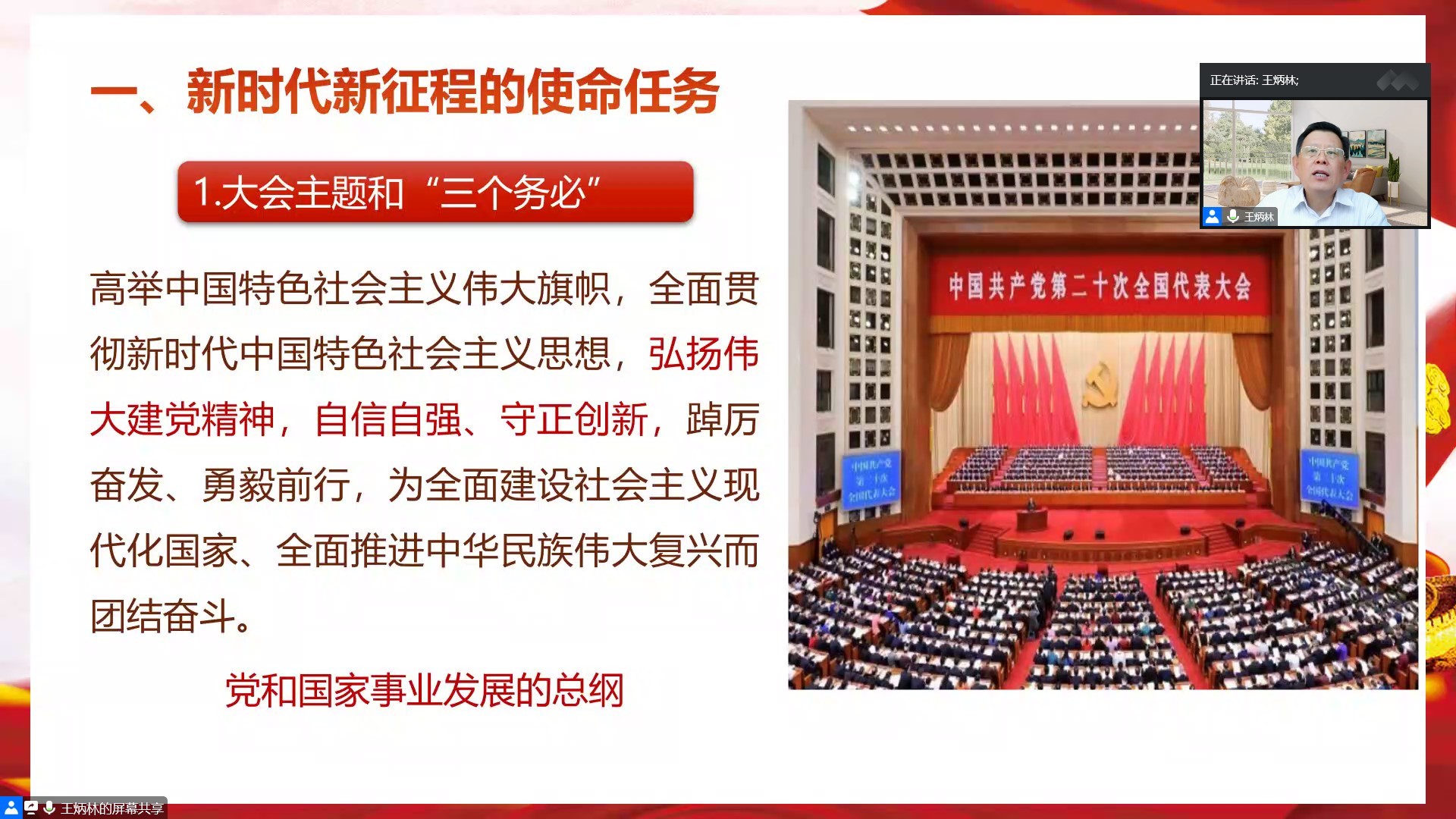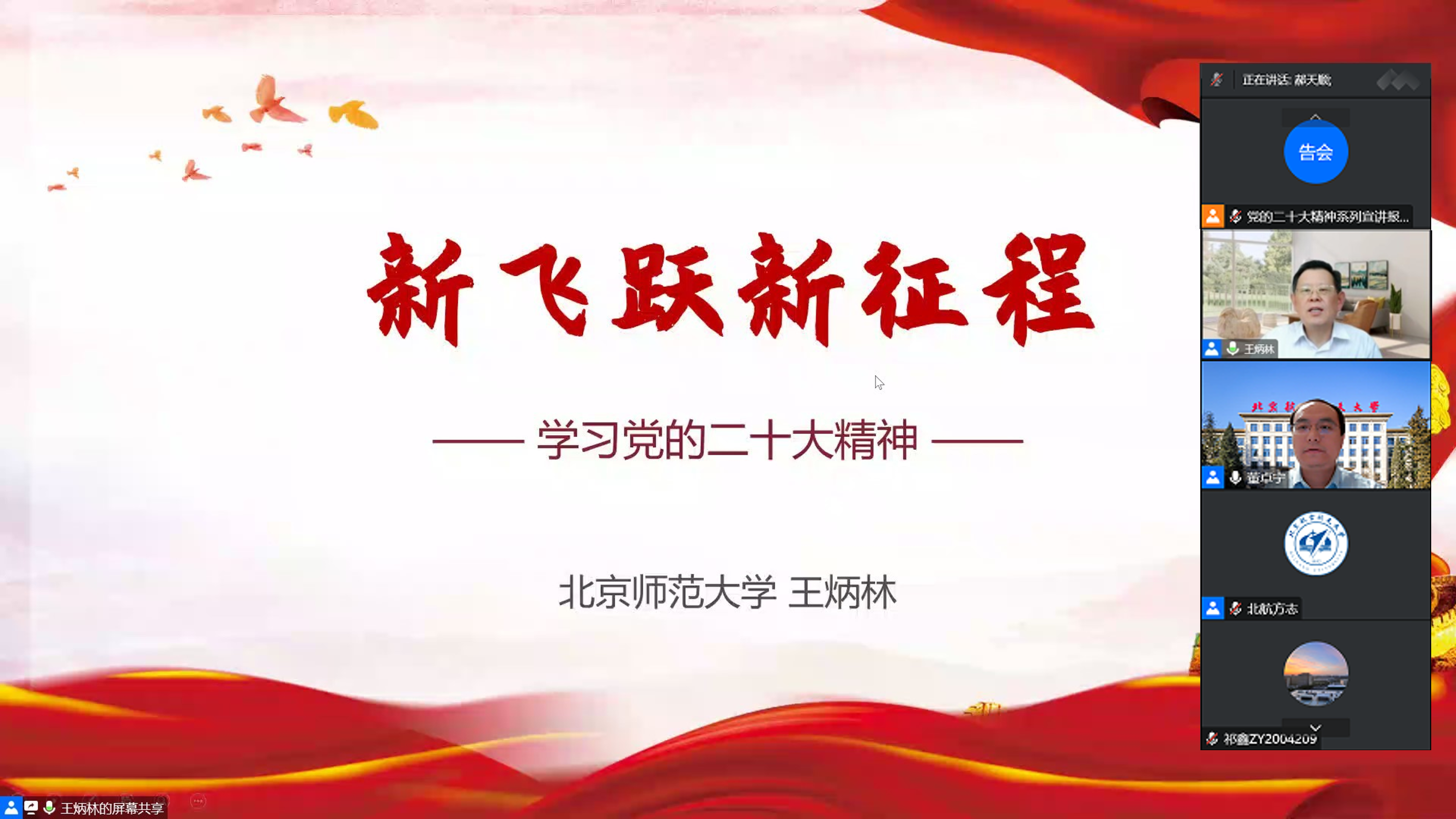 王炳林院长从“新时代新征程的使命任务”、“开辟马克思主义中国化时代化新境界”和“建设社会主义现代化国家关键在党”三部分详细解读了党的二十大精神。第一部分重温党的二十大主题,回溯中国共产党伟大的精神之源,从经济、科教兴国、政治、文化、社会生活等方面总结十年来党和国家的新飞跃;第二部分介绍了习近平新时代中国特色社会主义思想的主要内容和“两个结合”的重要性,指出要把马克思主义同人民日用而不觉的共同价值观念融通起来;第三部分介绍了中国式现代化的本质要求首先在于坚持中国共产党领导。同时,我们应该深刻领会“六个坚持”的重要意义,并注意防范化解风险挑战。他强调,全面建设社会主义现代化国家关键在党,中国共产党领导是全面建设社会主义现代化国家的根本保证,并且需要充分发挥全面从严治党的政治引领和政治保障作用。