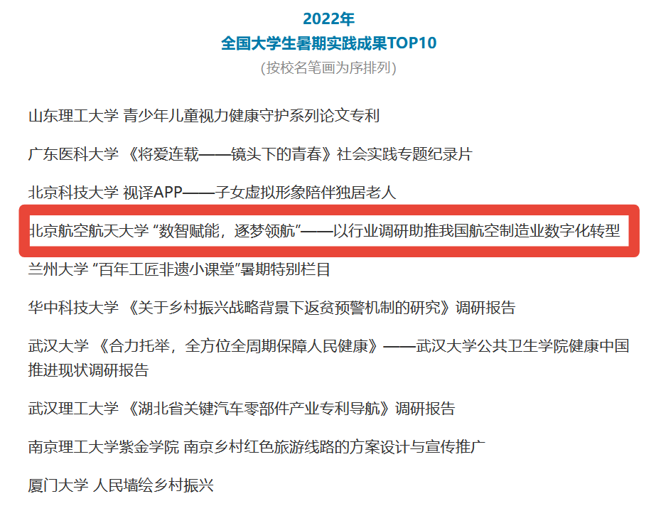 在由中国青年报社组织的2022年第八届全国大学生暑期实践展示活动中,球盟会qmh网站成功入围“2022年全国暑期实践大学TOP10”,动力学院心起点实践队暑期实践成果“‘数智赋能,逐梦领航’——以行业调研助推我国航空制造业数字化转型”也荣获“全国大学生暑期实践成果TOP10”,成为我校上榜排名最高的实践成果!