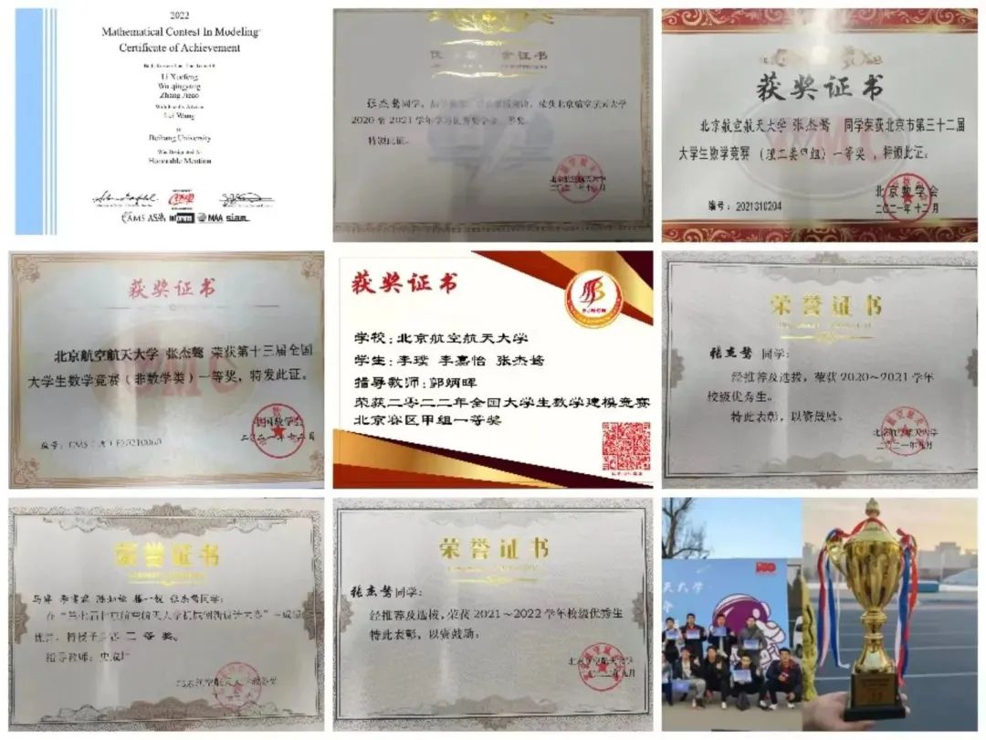 除此之外,张杰骜积极参加学科竞赛,深入探索课外知识。在精心准备下,他获得了全国大学生数学竞赛一等奖、美国大学生数学建模竞赛H奖、全国大学生数学建模竞赛本科组一等奖(北航仅三支队伍)等荣誉。