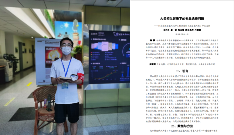 在志愿实践方面,张杰骜主动担任疫情防控志愿者,在人员密集处发放口罩,保障师生身体健康;他还积极参与寒假社会实践,调研大类招生背景下的专业选择问题,为新生提供专业指导。