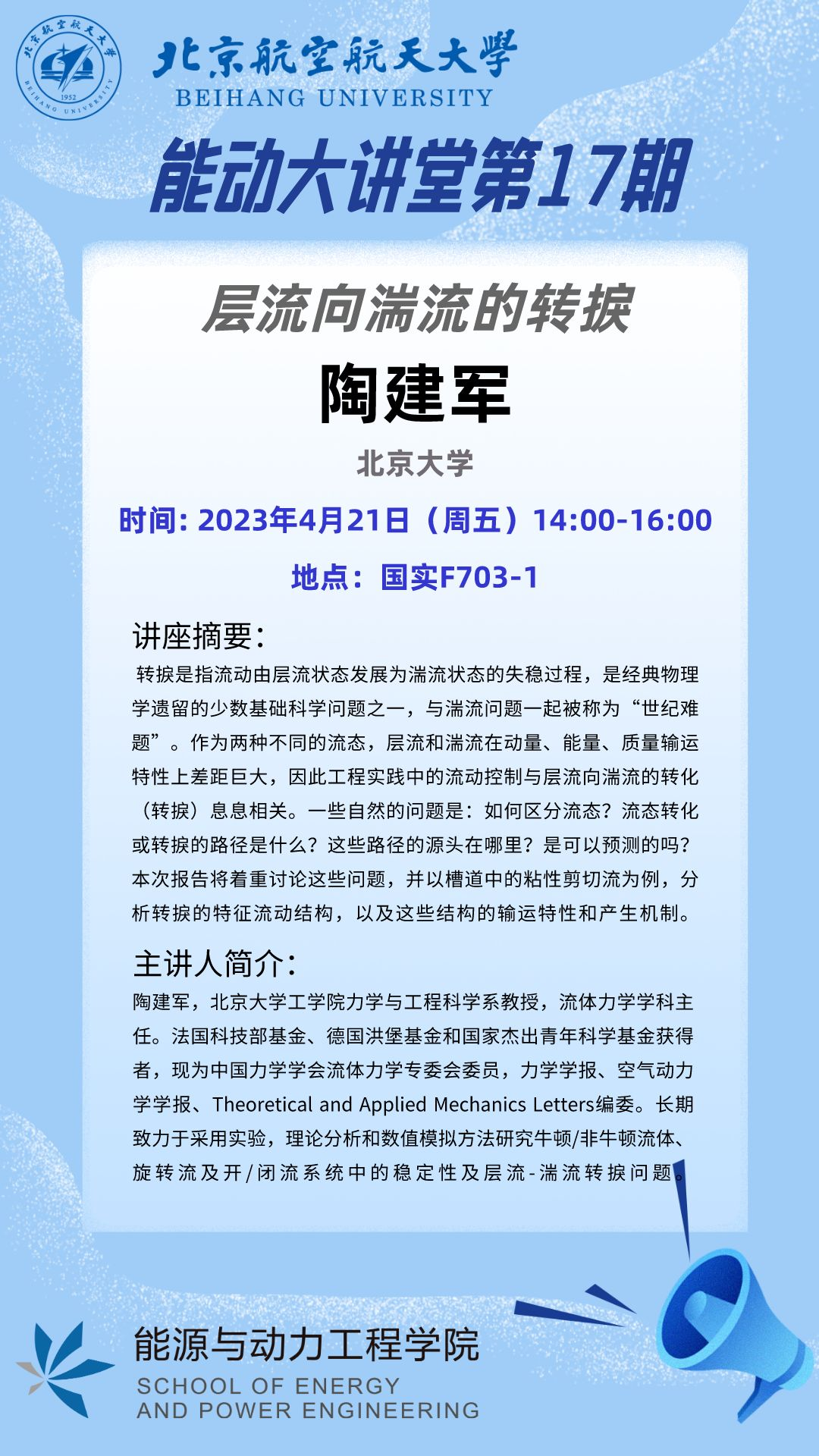 为了帮助同学们拓宽学术视野、了解学术前沿,qmh球盟会亚博特别举办高端学术论坛,邀请北京大学陶建军教授开展以“层流向湍流的转捩”为主题的学术讲座,与同学们共同探讨转捩难题。