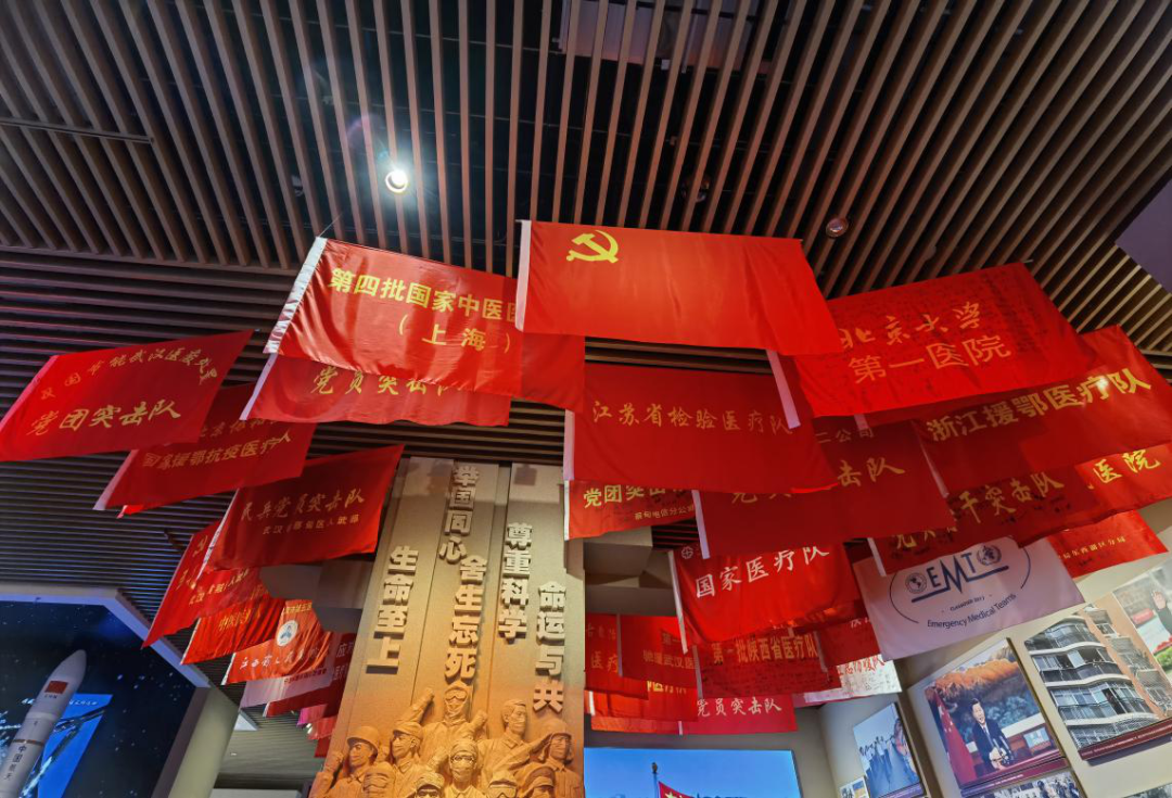 在展现伟大抗疫精神的篇章中,火神山雷神山医院模型、武汉解封后的首张车票等等众多图片实物,再次带人回首令人惊叹的“中国速度”“中国力量”“中国精神”;悬挂在高空的一面面医疗队、突击队的队旗上,逆行湖北的白衣勇士亲笔写下的名字密密麻麻,更是我国制度优势、人民众志成城的生动诠释。