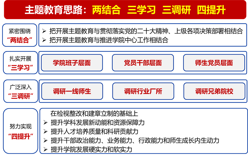 闫晓军传达了上级部门及学校党委关于主题教育的部署要求。学习贯彻习近平新时代中国特色社会主义思想,是新时代新征程开创事业发展新局面的根本要求。各级党组织和广大党员要切实把思想和行动统一到中央决策部署上来,提高政治站位,统一思想认识,强化责任担当,强化组织领导,不折不扣抓好贯彻落实,努力在以学铸魂、以学增智、以学正风、以学促干方面取得实实在在的成效,达到凝心铸魂筑牢根本、锤炼品格强化忠诚、实干担当促进发展、践行宗旨为民造福、廉洁奉公树立新风。