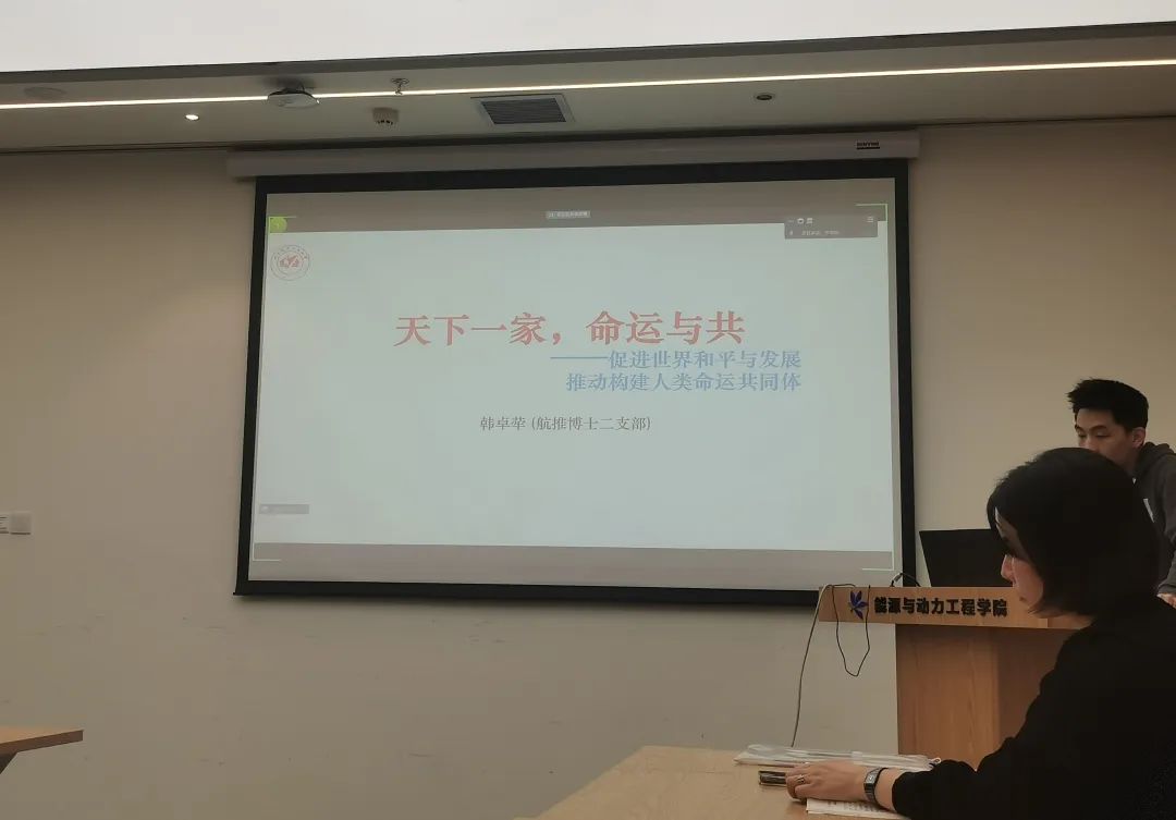 航推博士第二党支部书记韩卓荦做题为《天下一家 命运与共》领学。从人类向何处去这个问题,引入人类命运共同体理念。表述新时代新征程上该如何继续推动构建人类命运共同体。最后用数据和实例介绍了中国为促进世界和平与发展做出的重要贡献。