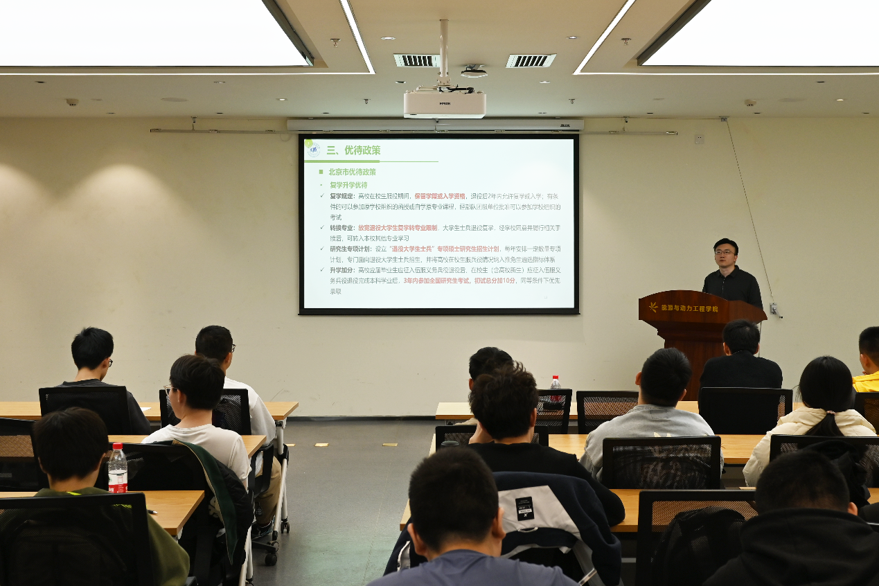 张大伟做应征入伍政策宣讲,从强军召唤、基本要求、优待政策、先进典型、应征报名五方面进行了详细解读,指出高校大学生入伍是新形势下加快军队国防现代化建设,实现强国梦、强军梦,维护国家总体安全的重要举措,鼓励同学积极响应国家号召,应征入伍投身军营。