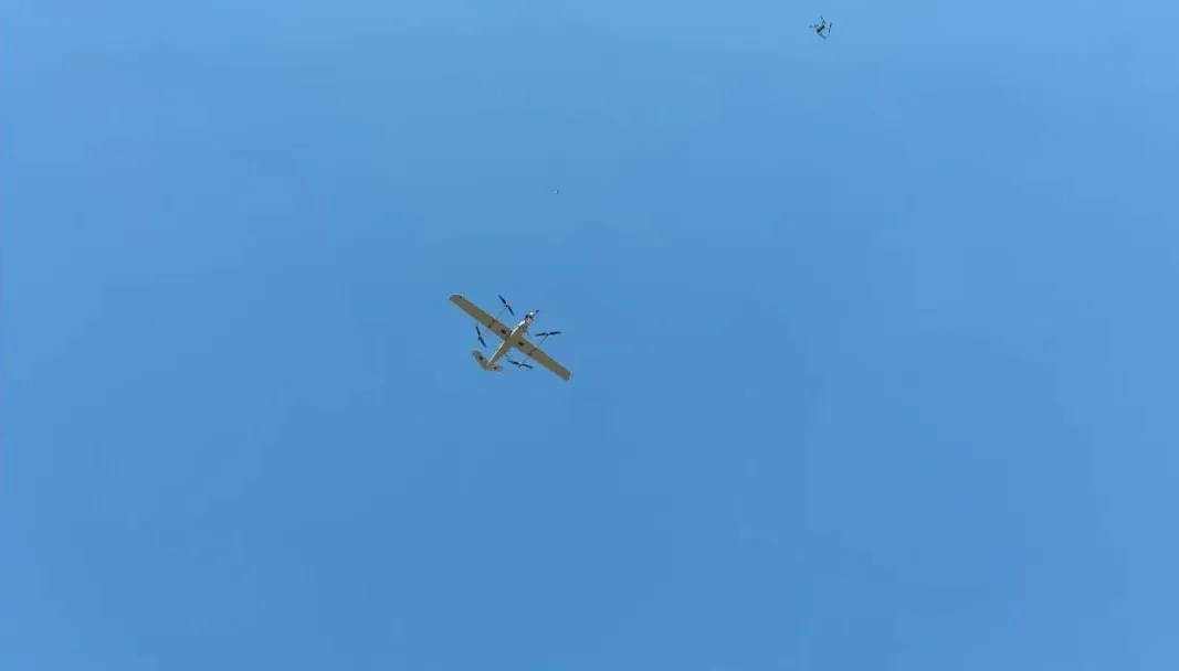 试飞无人机为翼展3.5m的复合翼无人机,垂起降落阶段使用锂电池为旋翼供能,平飞巡航阶段采用全电发动机提供推力。在试飞过程中,“北航氢动一号”全电航空发动机全程工作平稳,无人机成功完成起飞、巡航、机动、降落等设定科目,巡航阶段燃料电池输出功率稳定维持在1600W以上,在提供平飞功率的同时为锂电池充电,首次飞行试验圆满成功,巡航飞行时长18分钟。