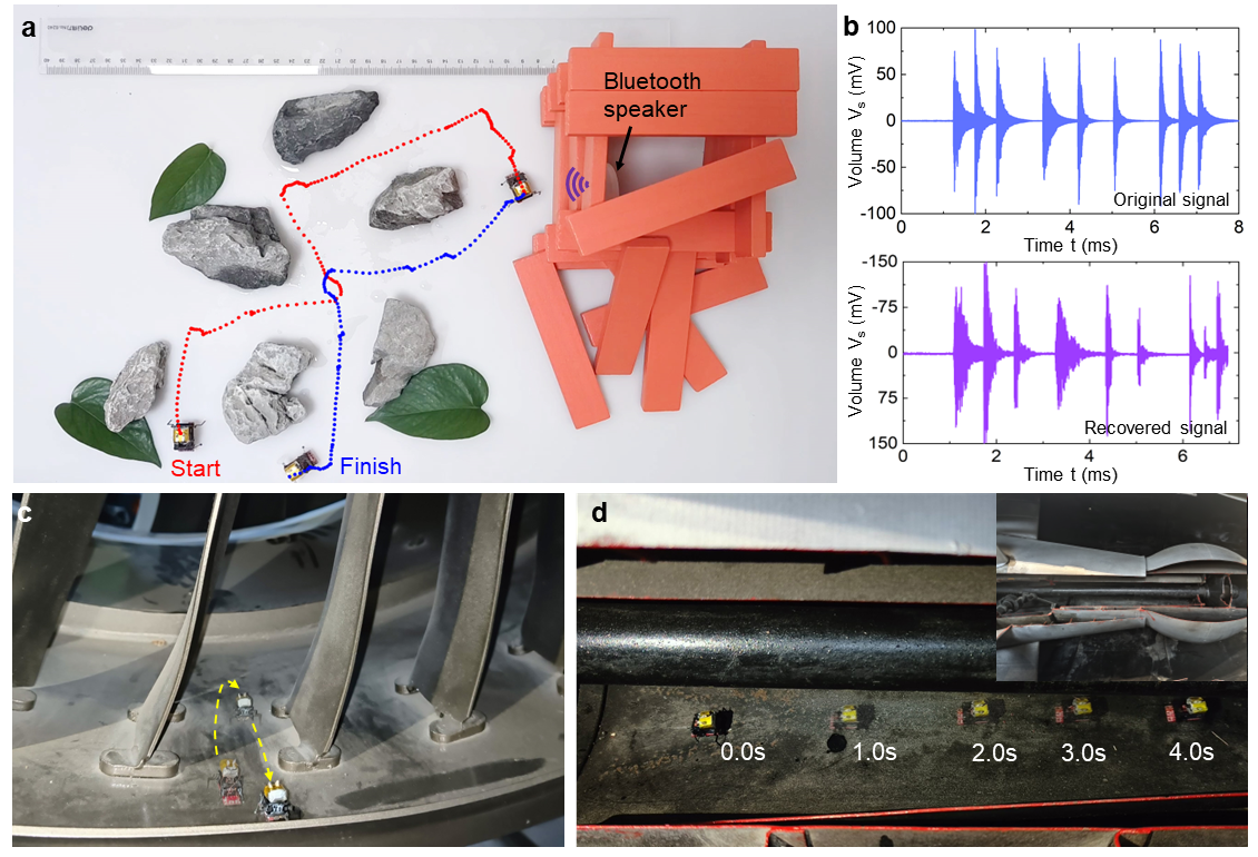 BHMbot机器昆虫可以适应多种应用场景,例如灾后救援、航空发动机检测等。目前已完成求救信号采集验证,可以模拟灾后搜救的场景。在模拟场景中,BHMbot机器昆虫穿过石头等障碍物后到达倒塌房屋附近,然后采集房屋内部发出的SOS求救信号并将其回传至控制端(图4a,图4b,见视频6)。除用于灾后搜救外,研究人员希望未来BHMbot机器昆虫也可用于航空发动机结构损伤检测。BHMbot机器昆虫体积小、机动性高,可以携带图像采集模块进入发动机内部开展结构损伤检测,可以克服现有目视检测和孔探检测技术可达性不足的缺陷。目前,BHMbot机器昆虫已经实现在航空发动机内部曲面结构上的脱线可控爬行,如涡扇发动机外涵道(图4c,视频7)、涡喷发动机尾喷管(图4d,视频7)。未来,BHMbot机器昆虫将集成微型摄像头以实现发动机内部结构的图像采集和回传,并基于采集到的图像开展结构损伤智能识别。