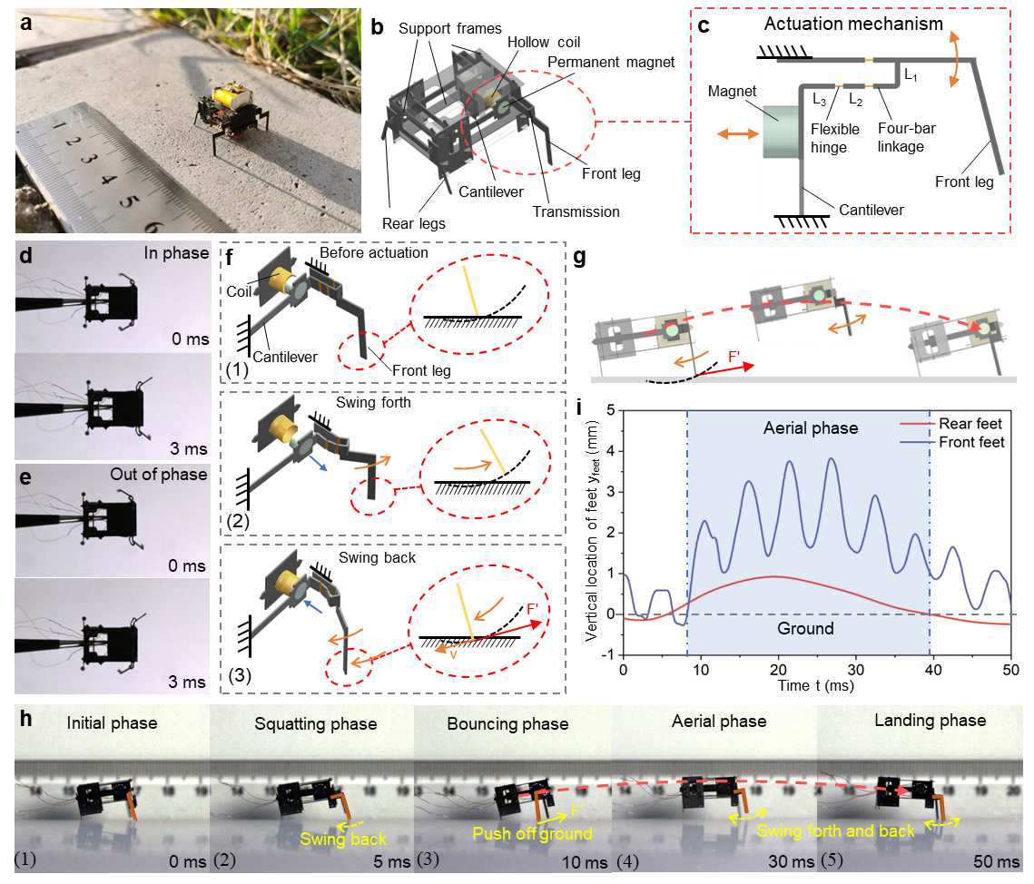 为提高微型动力系统的能量转换效率,团队发明了一种基于直线式驱动和柔性铰链传动的新型动力系统,可以在厘米尺寸下实现能量的高效转化。微型动力系统中,直线式驱动器将输入的电能转化为机械能,并向外输出机械振动;柔性铰链传动机构将这种振动转换为仿生腿的周期振动(图1de)和机器昆虫机体的高频弹跳运动(图1h),最终实现电能到动能的高效转换(图1)。