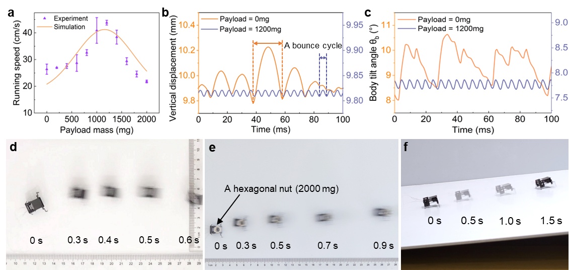 针对现有机器昆虫载重后性能衰退的问题,团队设计并实现了一种仿生奔跑步态(视频1)。奔跑过程中,BHMbot机器昆虫可以通过自身步频和步幅的自适应调节,实现高载重下的快速爬行。现有昆虫尺寸机器昆虫在集成电源和控制模块等载重后会出现速度骤降的现象(下降幅度可达90%),BHMbot机器昆虫能够通过跳跃频率的增加抵消单次跳跃步幅衰减带来的影响,当承载5.5倍自身质量的重物后,BHMbot仍能维持25倍身长每秒的速度(视频2)。当载重低于一定临界值时,BHMbot机器昆虫运动速度甚至可以实现随载重增加而上升的趋势(图2a)。