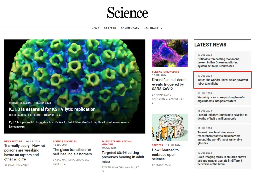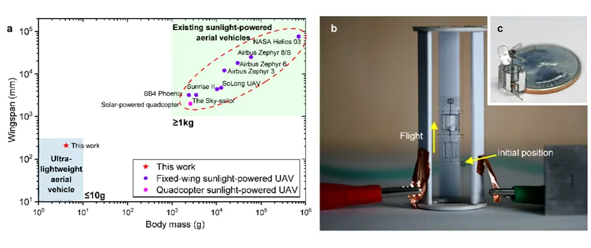 在本成果之前,此领域的最高水平成果是哈佛大学2019年在Nature发表的Robobee飞行器,但仍需采用人工光源(三倍太阳光)才能实现持续飞行,而本成果仅依靠自然光即可实现持续飞行,可极大拓展此类飞行器的使用范围,在微型飞行器的发展进程中具有里程碑意义。