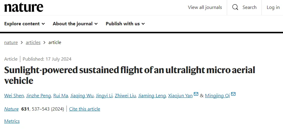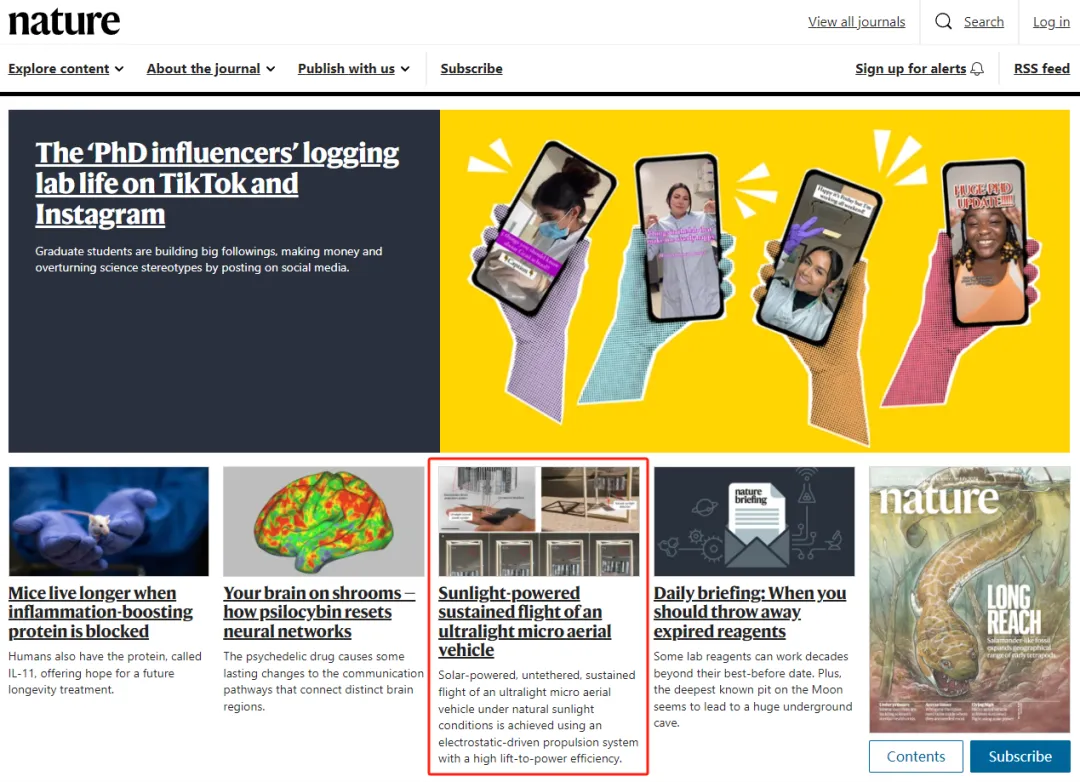 最新研究成果,北航研制新原理发动机——自然光即可实现持续飞行的静电飞行器,北航qmh球盟会亚博漆明净、闫晓军等,相关成果以Article形式在线发表于《Nature》杂志,并同时获Nature和Science首页推荐。