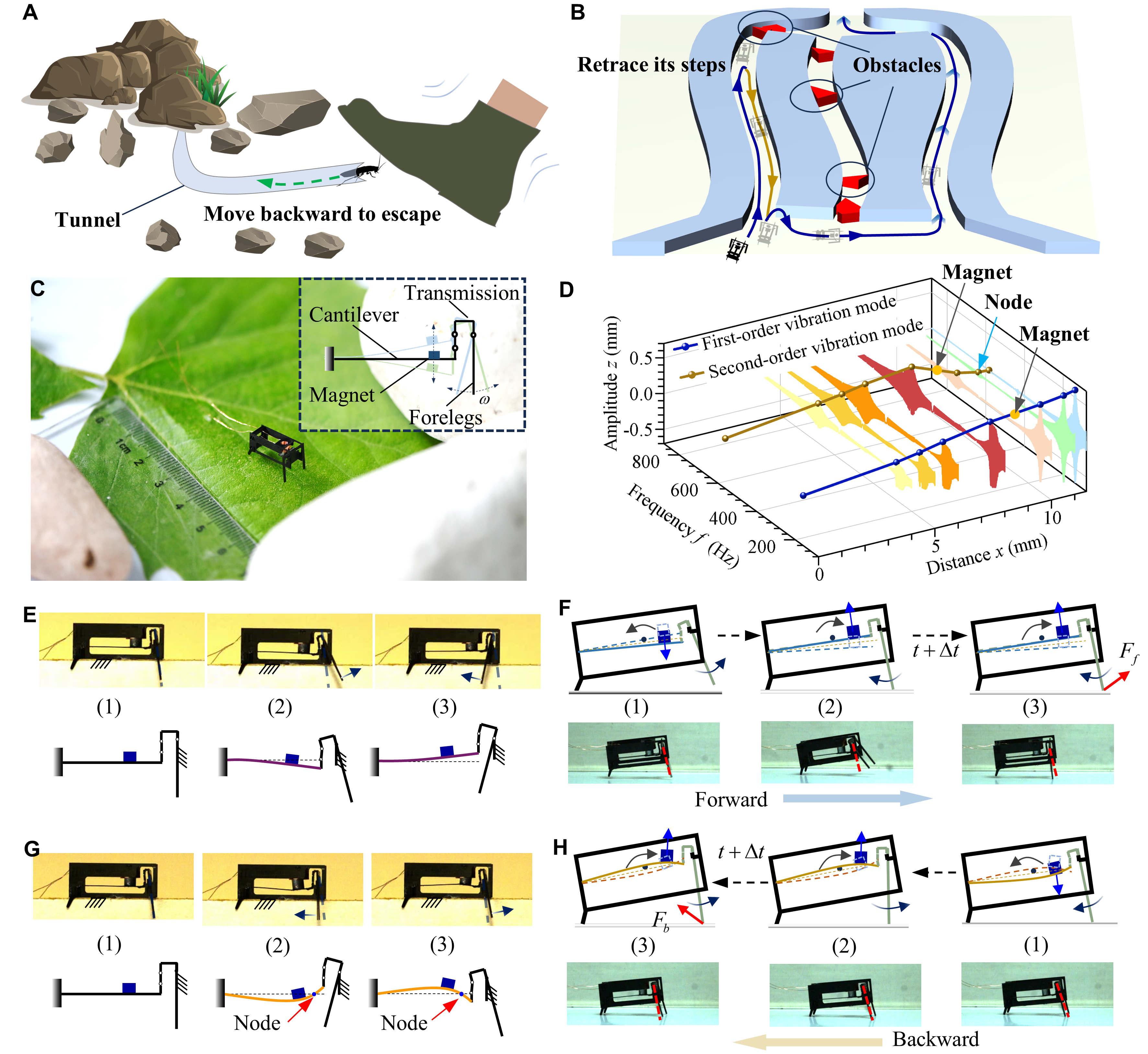 在这项研究中,研发团队根据BHMbot-B机器昆虫的新型动力系统结构,提出了一种基于振动模态变换的前进、后退控制方法,通过将动力系统的振动悬臂梁、传动铰链、仿生腿和机身的运动进行有机组合,巧妙运用振动悬臂梁一阶、二阶振动分别实现前进和后退运动。当悬臂梁处于一阶振动模式时,机身俯仰与前腿摆动同相,机器昆虫向前快跑;当悬臂梁处于二阶振动模式时,机身俯仰与前腿摆动反相,仿生机器昆虫实现快速“倒跑”(图1)。