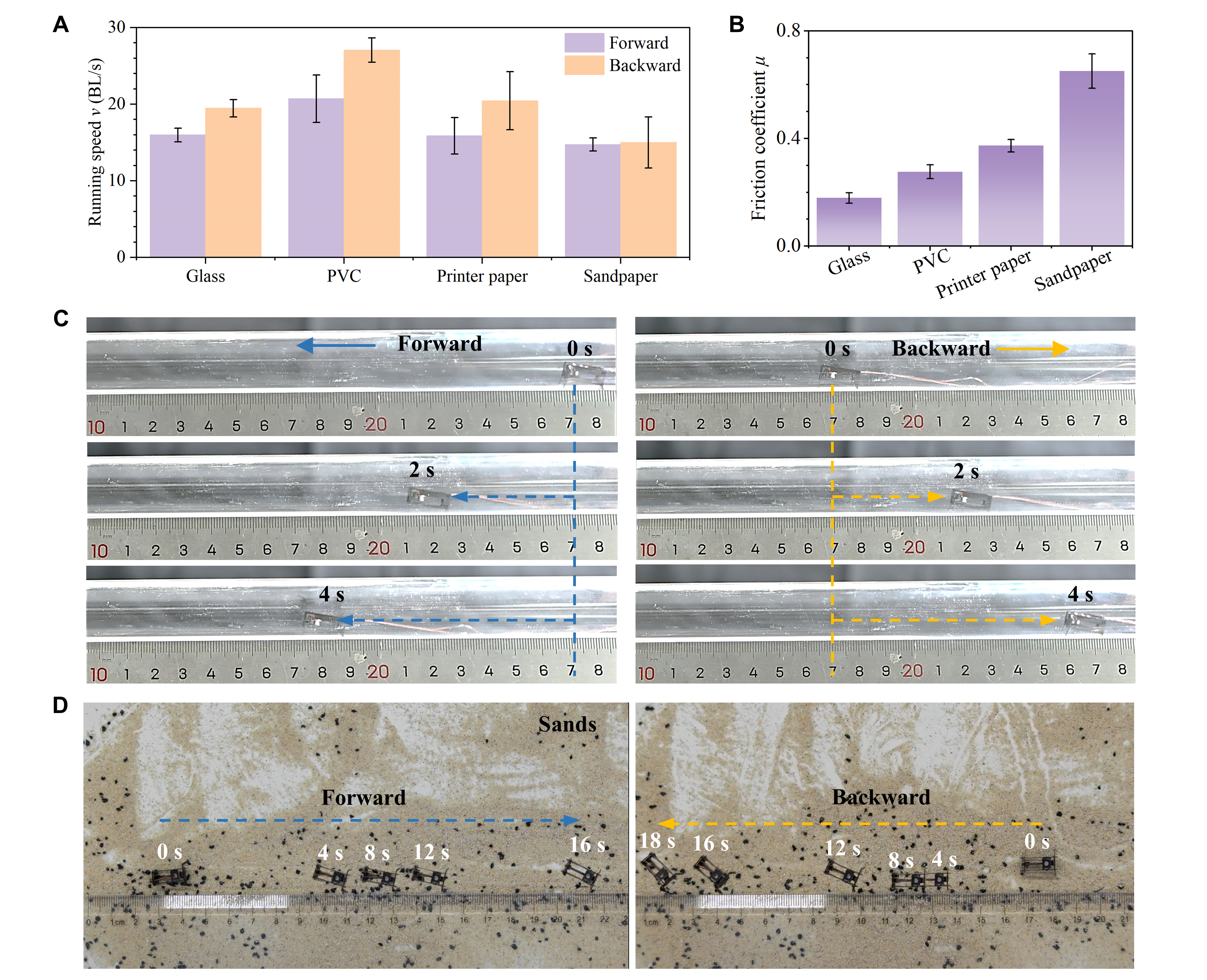 得益于高效的动力设计,BHMbot-B同样可以实现与哺乳动物类似的仿生奔跑步态(BHMbot所采用的步态),带线状态下前跑速度能达到38.7倍体长每秒,倒跑速度能达到44.0倍体长每秒,双向爬行速度在同尺寸量级微型机器昆虫中均处于国际先进水平。此外,BHMbot-B机器昆虫的前进后退双向运动能力具有良好的环境适应性,可以适应多种不同粗糙度表面(视频1)、管道曲面、沙地地形与水下环境(视频2),为机器昆虫走向实际应用场景奠定了良好的技术基础(图2)。