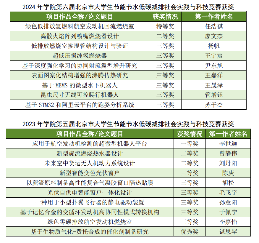 过去的三年中,我校连续三年所有参赛项目获奖,连续三年获优秀组织奖。动力学院学子也屡创佳绩,2024年第六届北京市大学生节能节水低碳减排社会实践与科技竞赛竞赛中获特等奖一项、二等奖一项、三等奖七项,2023年第五届北京市大学生节能节水低碳减排社会实践与科技竞赛中获一等奖一项、二等奖三项、三等奖六项。