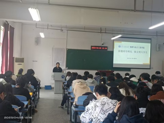 为进一步树立校园文明礼仪形象,以饱满的热情迎接教育部本科合格评估工作,2023年4月25日,物电学院开展“崇德尚学明礼 做文明大学生”主题教育活动。院党总支副书记张玉龙,辅导员老师李朦、范志鹏,全体学生干部参加了活动。
