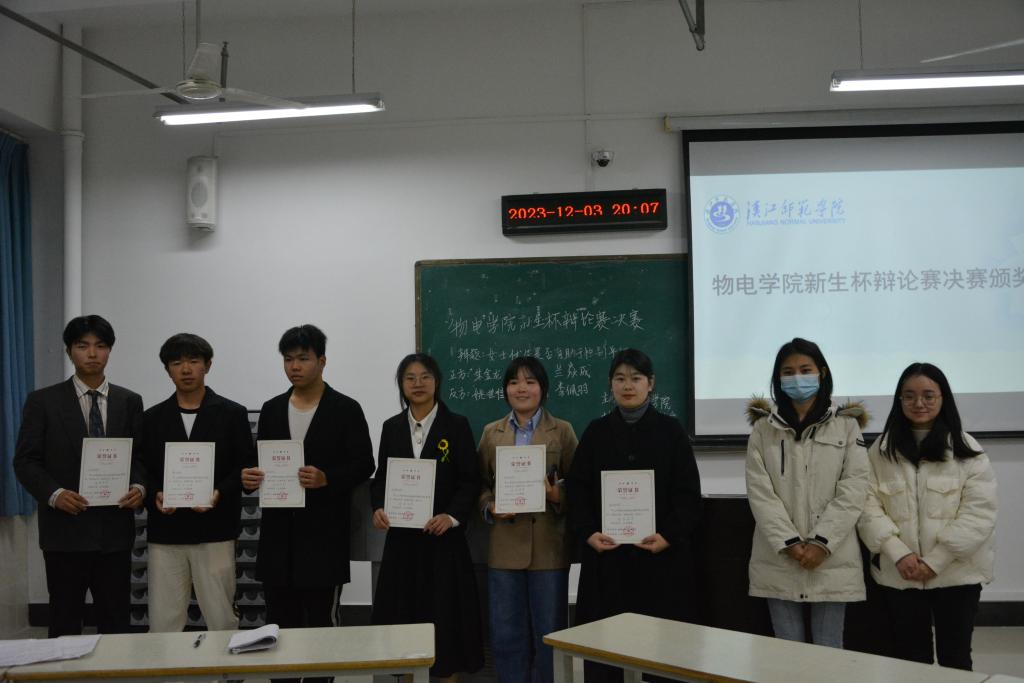 12月3日晚19点,物电学院2023年“新生杯”辩论赛决赛在尚艺楼A401举行。辅导员陈秋雨、班主任李娜、辩论协会社长白露清、副社长梁煜萌、辩论协会辩论队队长程锦一、辩论协会辩论队副队长张宇航等应邀担任比赛评委,2023级40名学生现场观看了比赛。