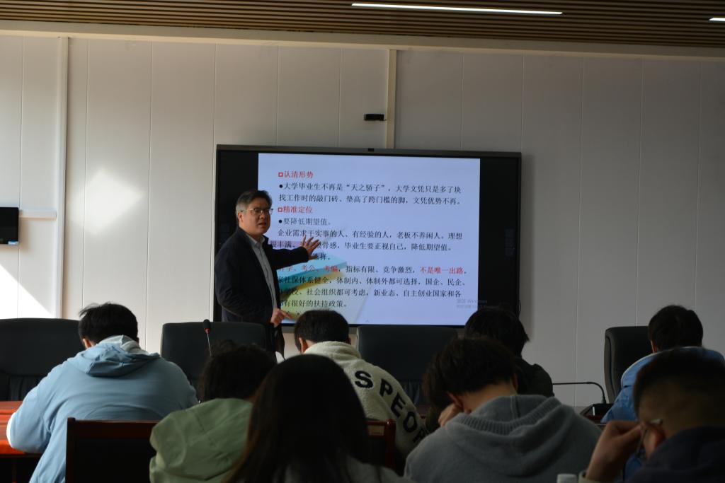 会上,唐传球结合近年来全国高校毕业生就业情况、学院毕业生就业数据和国家政策,分析了当前毕业生就业形势,针对当前同学们面临的问题与挑战,提出五点建议:一是认清当前就业形势,精准定位,合理设定就业期望值;二是转变就业观念,树立“先就业再择业”的观念,把握时机,早就业、快就业;三是拓宽就业思路,理性分析自己的优点和特长,多渠道就业;四是不要盲从,适当参考家人朋友意见,确定自己的目标,然后坚定地走下去;五是做好就业准备,认真撰写求职简历,学习应聘礼仪,关注就业信息,积极参加招聘会及面试,积累丰富求职经验。会后,同学们也纷纷表示将就业压力变为动力,不等不靠、主动作为、坚定信心、发挥优势为美好未来奋力拼搏。