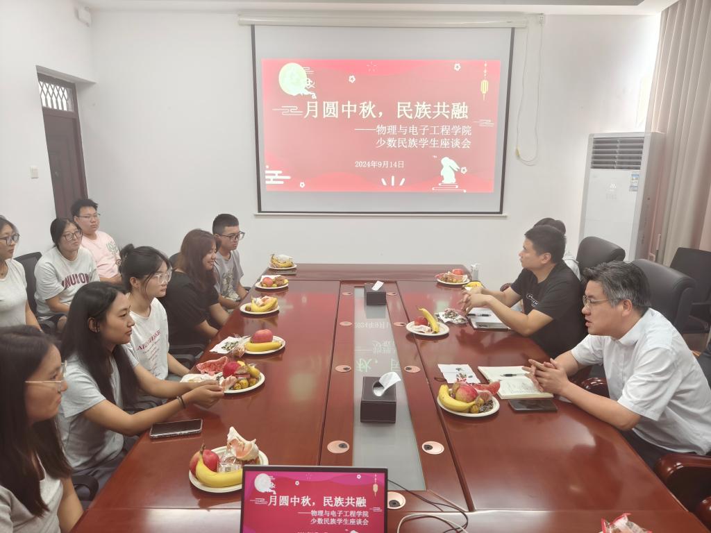 在中秋佳节即将到来之际,9月14日上午,物电学院在崇文楼A503举办了少数民族学生座谈会。院分党委书记唐传球、分党委副书记戴俊、分团委负责人范志鹏以及14名来自不同民族的同学们参加了此次座谈会。