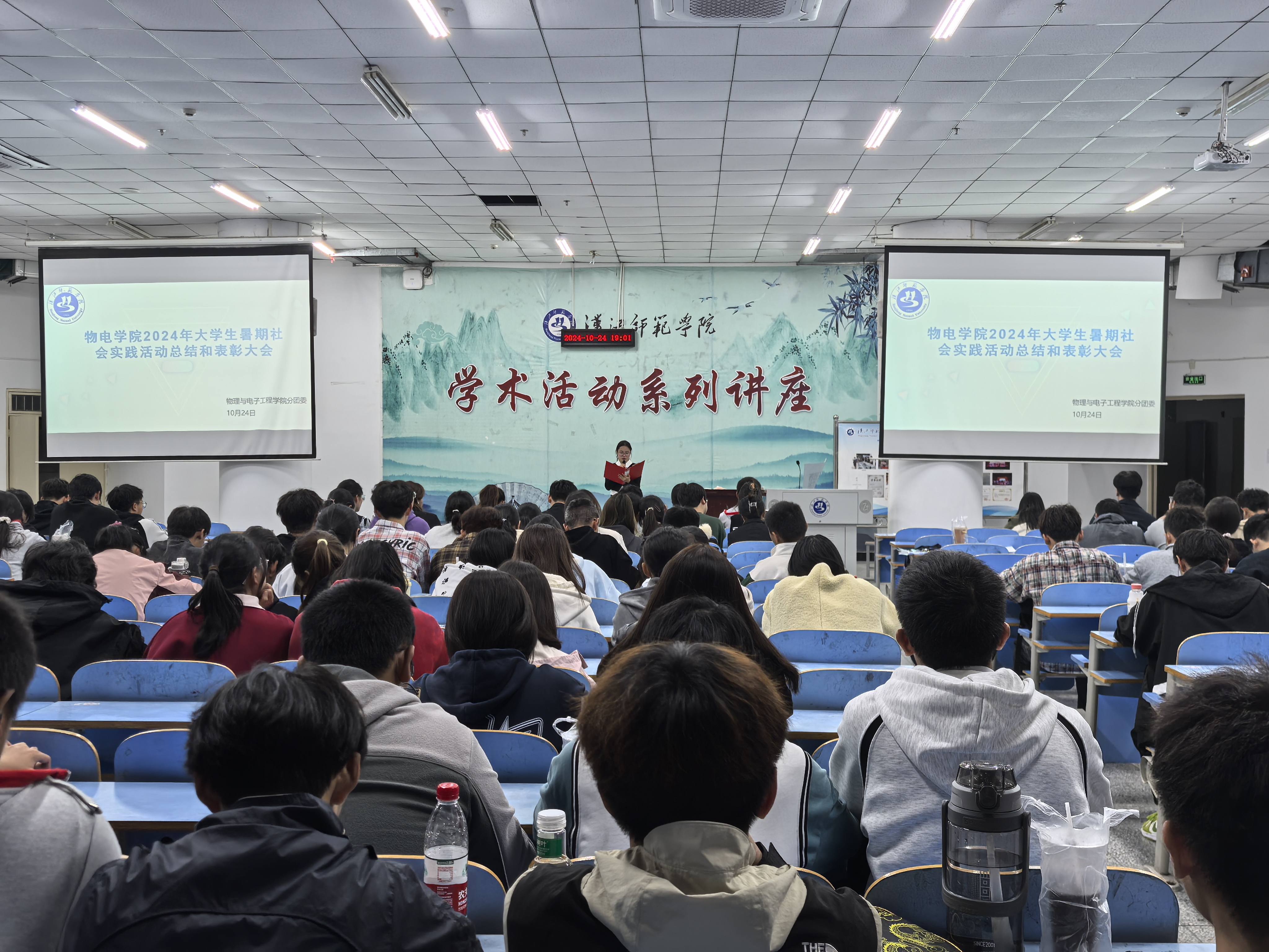 10月24日晚,物电学院2024年暑期社会实践总结暨表彰大会在崇文楼C201举行,院分党委副书记戴俊,分团委负责人范志鹏,辅导员田梦谣、贺培参加会议并担任评委,各实践团队成员和200余名2024级学生现场观摩学习。