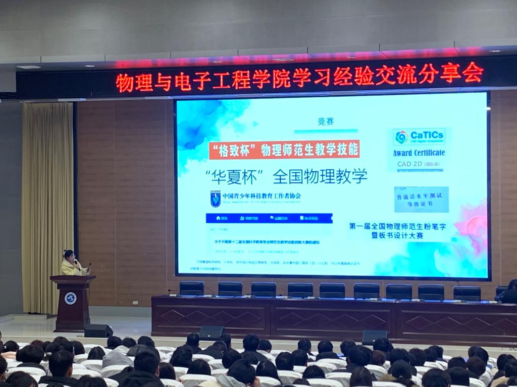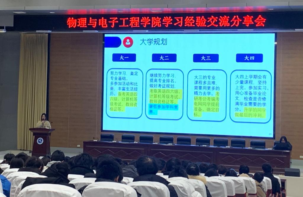 会上,2022级和2023级优秀学生代表依次登台,分享自己的学习经验。电气2201班黄玥桐重点介绍了专业学习方法,希望同学们在大学的各阶段都应明确目标、做好规划,积极学习、实践,不断提升综合素质和竞争力;物理2201班孙祖英介绍了大学各个阶段的学习重心,强调了了解专业人才培养方案的重要意义,分享了校内各种学习资源的使用方法;信工2201班向泽冬详细介绍了各类学科竞赛及参赛注意事项,希望同学们积极参与,真正做到以赛促学,提升自我;科教2301班田雯清分享了个人学习成长的心路历程和体验,希望同学们勇于实践,积极地将想法投入到行动,在实践中检验学习成果,增强个人能力。
