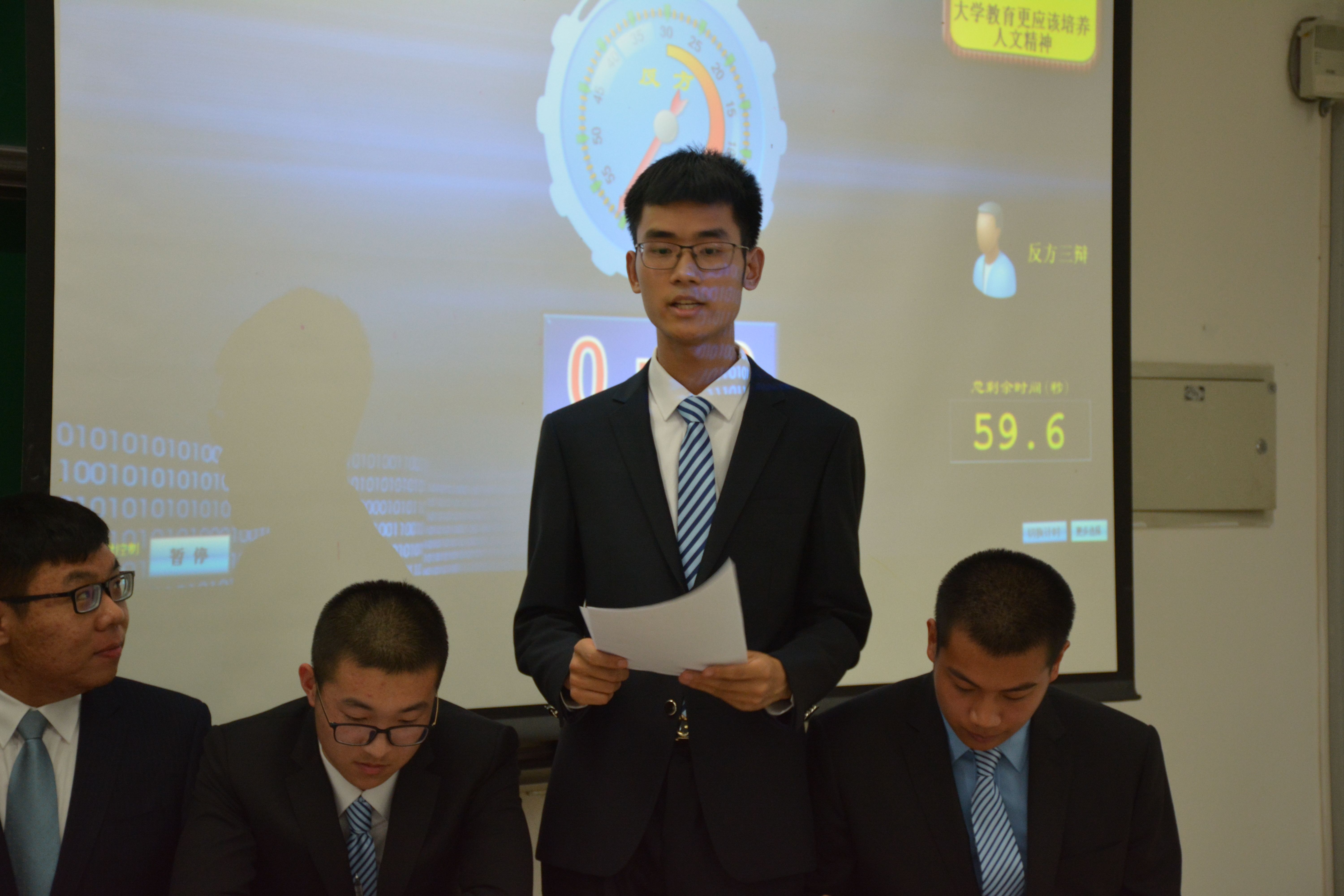 立论环节开宗明义,正方一辩杨兴峰从大学培养人才的目的等方面论述己方观点;反方一边陈禹澄则从人文精神对大学生成长、社会发展的影响等角度论述己方观点。驳论环节,正方二辩车俊新、反方二辩徐祥博就“什么是服务社会”“人文精神的重要性”等问题展开讨论。