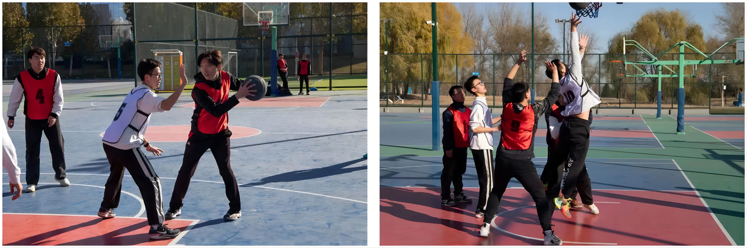 次节比赛继续,双方渐入佳境。眼神交流,手势示意,运球,转身,跳投。教师队凭借出色的团队配合不断传切篮下,上篮取分。学生队运用精准的投射与篮下高度保持着比分的领先。