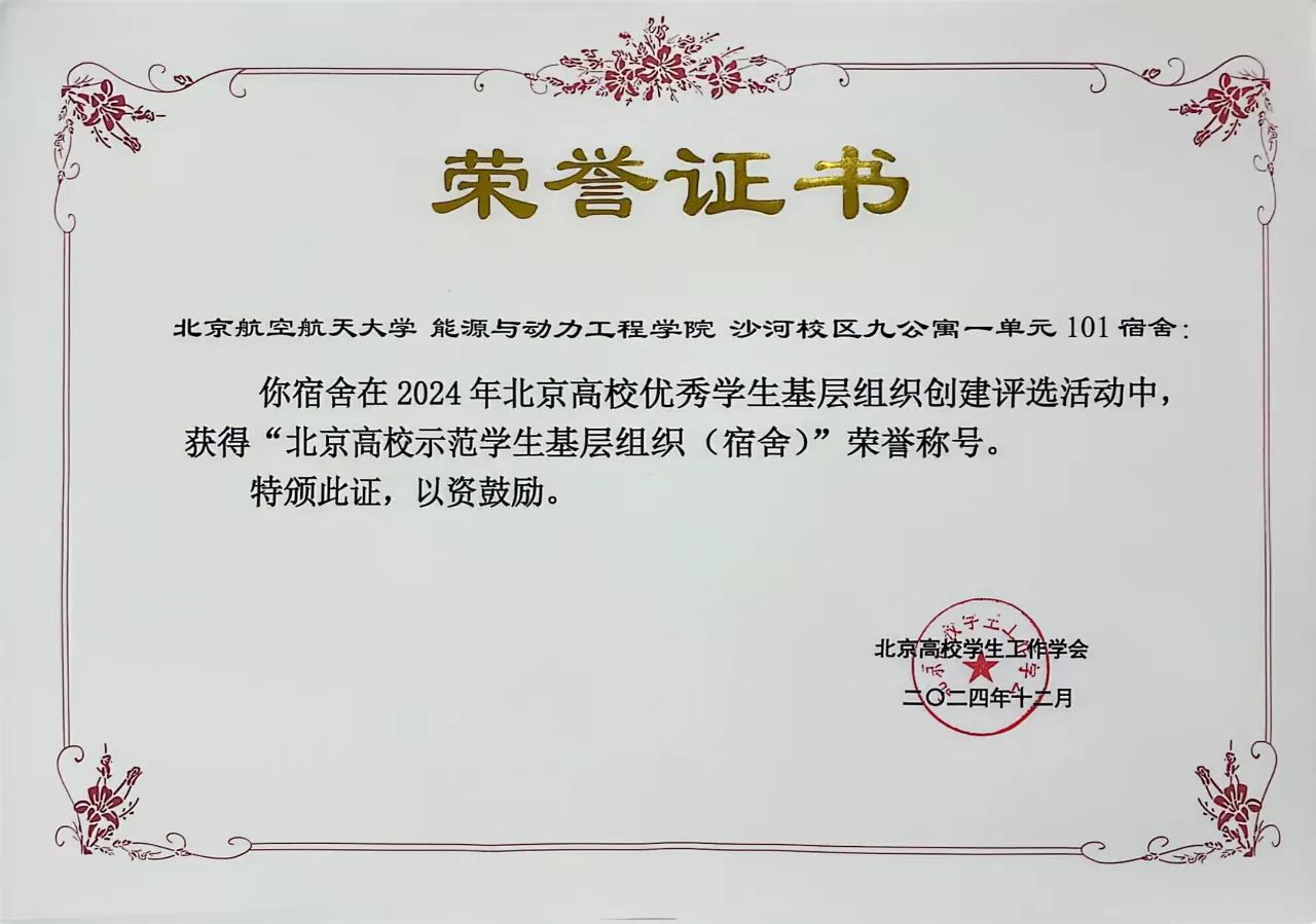 近日,2024年北京高校优秀学生基层组织创建评选活动落下帷幕,我院沙河校区九公寓一单元101宿舍获得北京高校示范学生基层组织(宿舍)荣誉。