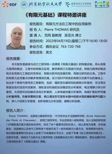 2022年04月19日下午16:00-18:00,应我院范雨副教授邀请,作为我院“航空推进理论与工程111引智基地”专家,法国电力集团研究员Pierre THOMAS 研究员为我院师生作了题目为“有限元方法在工程中的应用案例”的线上报告。