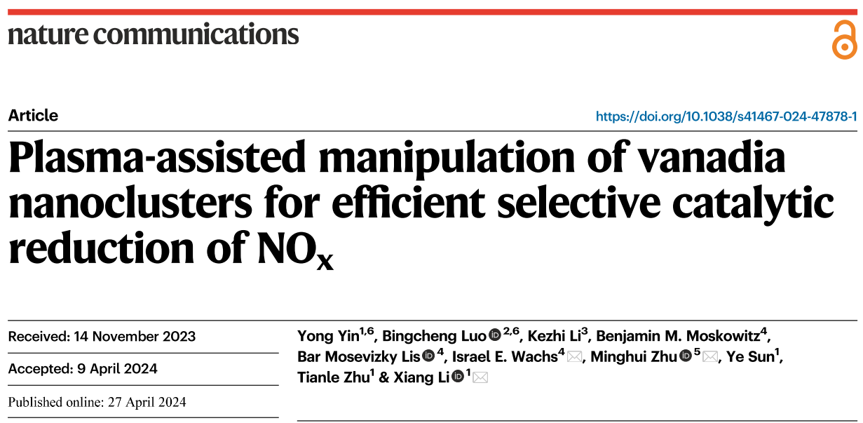 近日,球盟会qmh网站qmh球盟会亚博李想副教授团队与合作者在固定源烟气污染物控制领域取得重要进展。选择性催化还原是最广泛应用的烟气脱硝技术,然而传统钒基催化剂反应温度高难以适用于钢铁、水泥等工业窑炉的脱硝应用。如何通过活性位点精准调控强化钒基催化剂脱硝性能一直是该领域的挑战。团队基于H2低温等离子体表面处理,实现了低钒含量下高活性亚纳米钒氧团簇的快速合成,将脱硝效率提升十倍以上,并发现了吸附桥式硝酸盐参与氨活化的新反应路径,为固定源烟气脱硝提供了新思路。2024年4月27日,相关研究成果以“Plasma-assisted manipulation of vanadia nanoclusters for efficient selective catalytic reduction of NOx”为题在线发表于《自然·通讯》(Nature Communications)杂志。